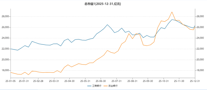 2025年9月4日,农行总市值触及2.55万亿元,历史性地超越“宇宙第一大行”工商银行,一度登上A股市值冠军宝座。截至2025年12月31日收盘,工行仍旧以2.63万亿元位居总市值榜首,农行以2.61万亿元紧随其后。
